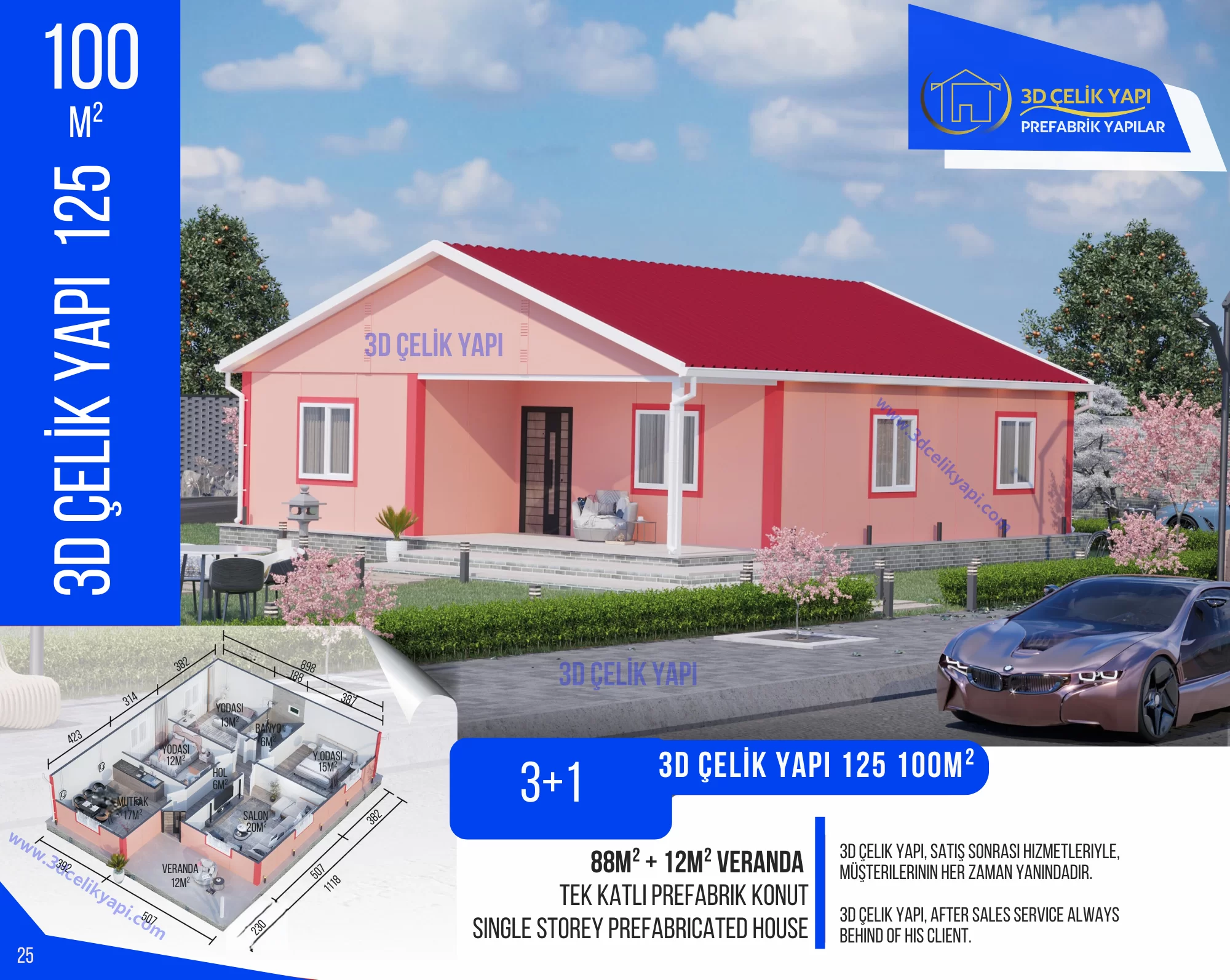 Yapımız 100 Metrekare kullanışlı prefabrik ev yaptırmayı düşünen müşterilerimizin aradığı yapı olma özelliğini taşımaktadır.