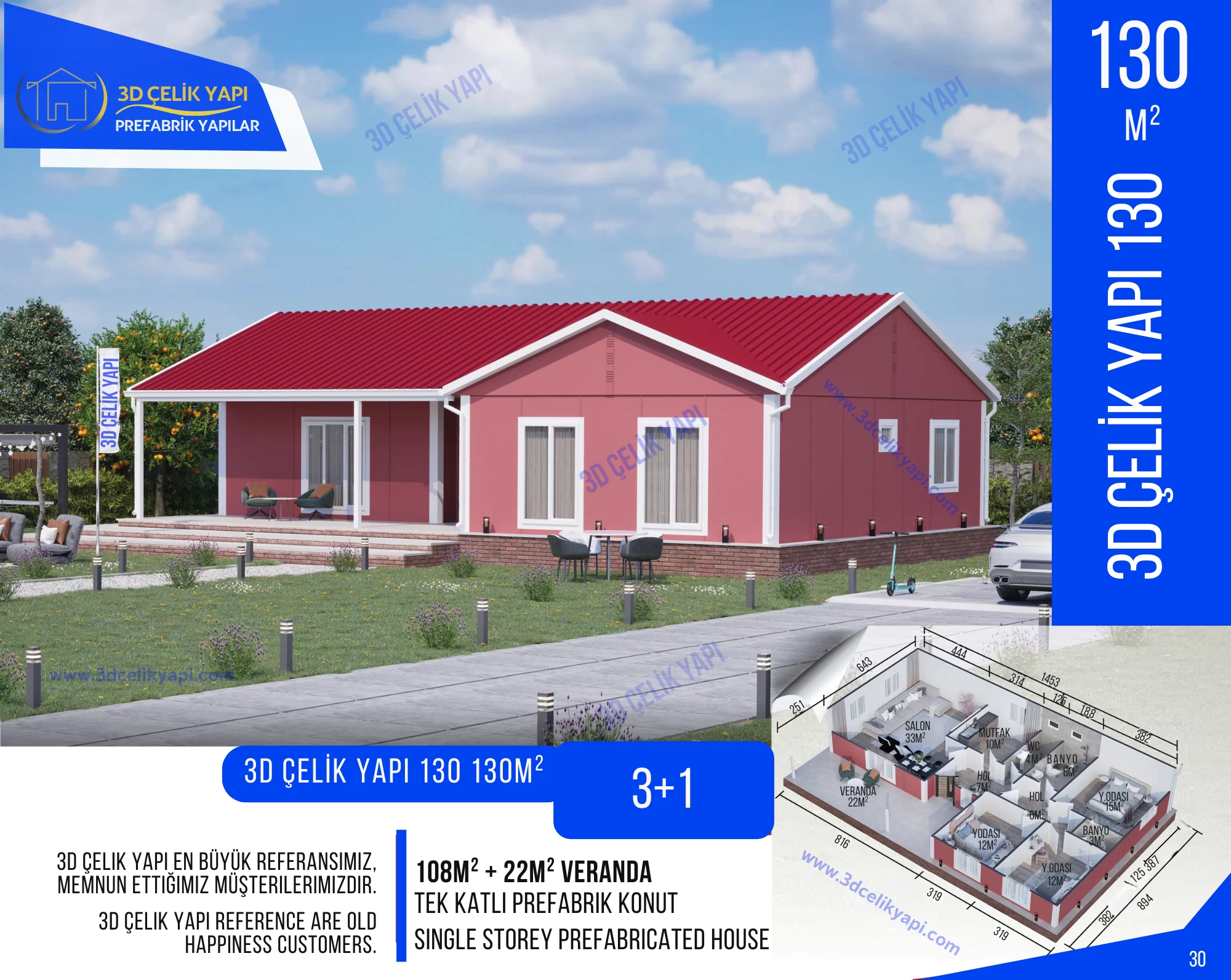 3D Çelik Yapı Tek Kat Prefabrik Ev 130 m² 3+1 MODEL 130