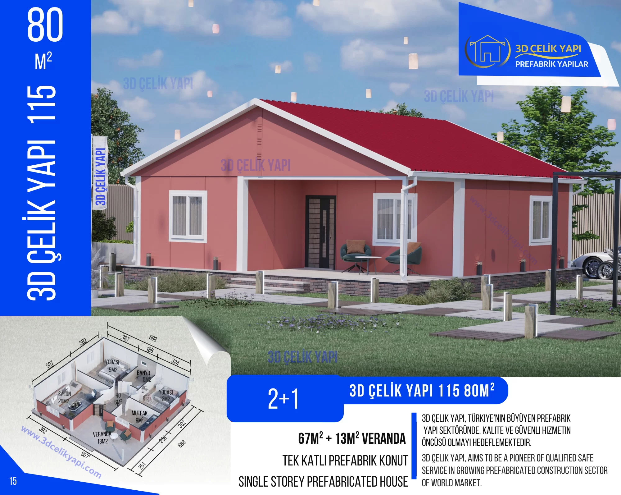 80 Metrekare kullanışlı bir yapıdır. Yapımız bulunduğu yere renk katacak tasarımda